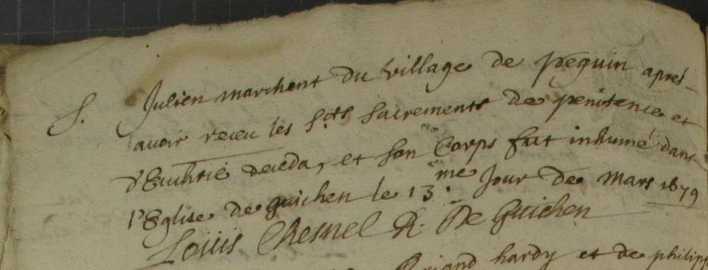 Officiant : JannyDécès : 26 février 1746 à Guignen 35580 Coëmur