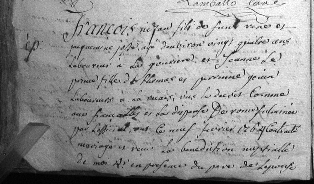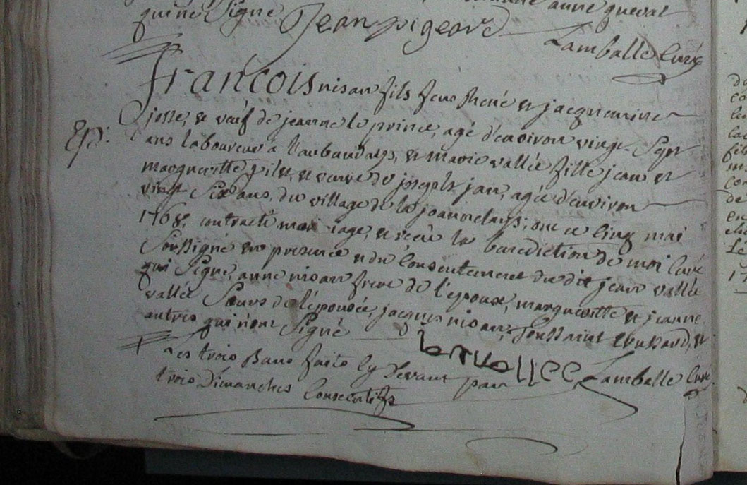 temoin mariage: X LAMBALLE, lien: pretre officiant , titre: Officiant religieux)Domicile : 1768 à Goven 35580 Vaubandays Événement : 4 mai 1768