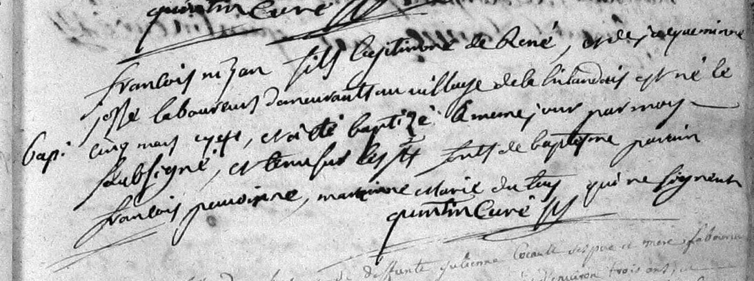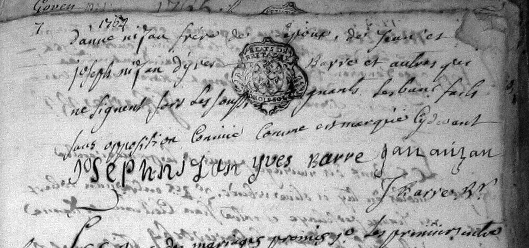 Marié le 9 février 1764, Goven,35580,Ille & Vilaine,Bretagne,FRANCE, avec Jeanne LEPRINCE 1732/-/1768 (Parents : Thomas LEPRINCE †1764/ & Perrine GOUIN ca 1705) (témoins : Yves BARRE †1764/ , Joseph NIZAN †1764/ , Jean NIZAN †1764/ , J BARRE †1771/ , Thomas LEPRINCE †1764/ , Anne NIZAN 1737-1768/ ) (
