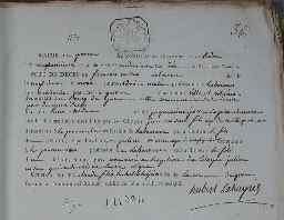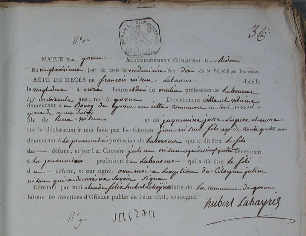 Acte de naissance d'anne Marie nisan née le vingt qutre octobre à minuit, fille de jean nisan et d'anne chevrier Laboureur, demeurant au village du Landrel en cette commune. Le sexe de l'enfant a été reconnu être du féminin, premier témoin René anne chevrier grand père maternel, parrin de l'enfant, âgé de soixante cinq ans, laboureur, demeurant au village de Landrel, second témoin Joseph Piel, âgé de quarante ans, Laboureur, demeurant au village de la Buchais ; Surla déclaration à nous faite par jean nisan père de l'enfant ; lesquels témoins et déclarant après lecture du dit acte ont déclaré ne savoir signé ; constaté suivant la loi par moi claude félix hubert Delahayrie Maire de Goven faisant la fonction d'officier public de l'état civil soussigné.
