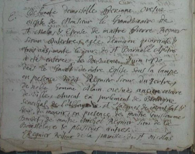 Niepce de Monsieur le Grand Vicaire de Saint MaloInhumation : 12 juin 1720 à Montfort-Sur-Meu 35160 Saint Nicolas