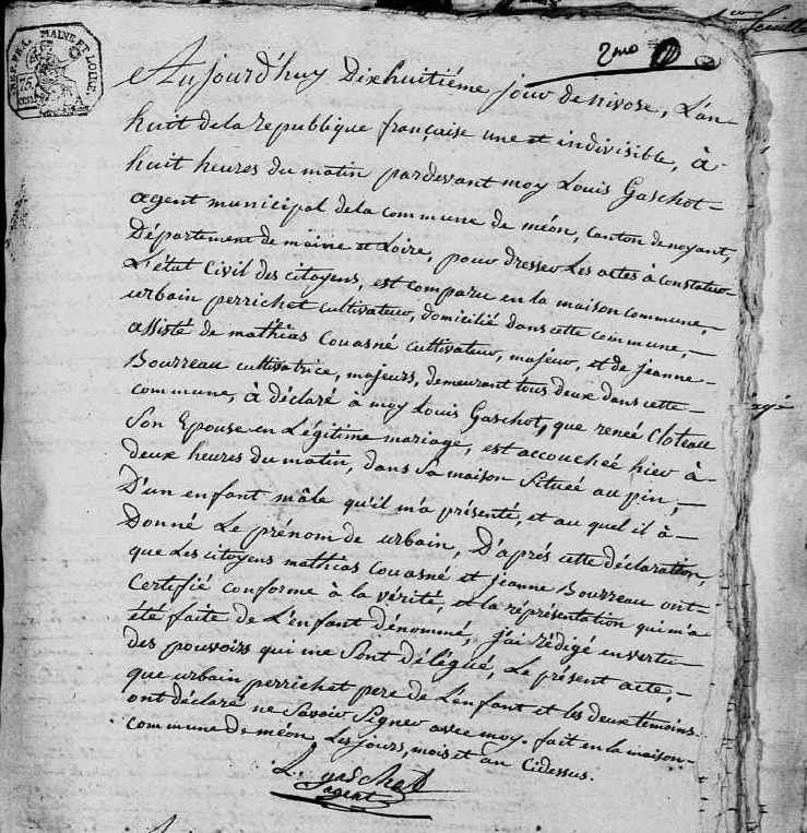 Naissance : 18 nivôse an VIII à Méon 49490
