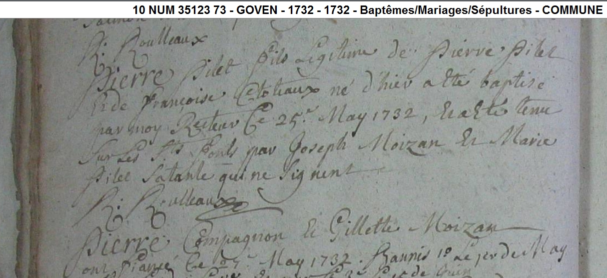 Naissance : 6 janvier 1719 à Goven 35580 Baptême : 7 janvier 1719 à Goven 35580