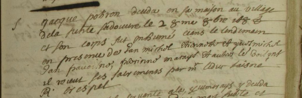 Baptême : avant 1640 à Guichen 35580 Décès : 28 octobre 1684 à Guichen 35580 en sa maison au village de la petite Sadouvre