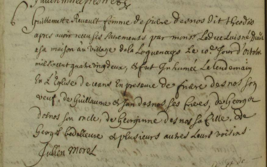 le mariage relevé donne ROUAULT en 1656 homonymie possibleDécès : 10 octobre 1682 à Guichen 35580 en sa maison au village de la Locquenays Inhumation : 11 octobre 1682 à Guichen 35580 Eglise