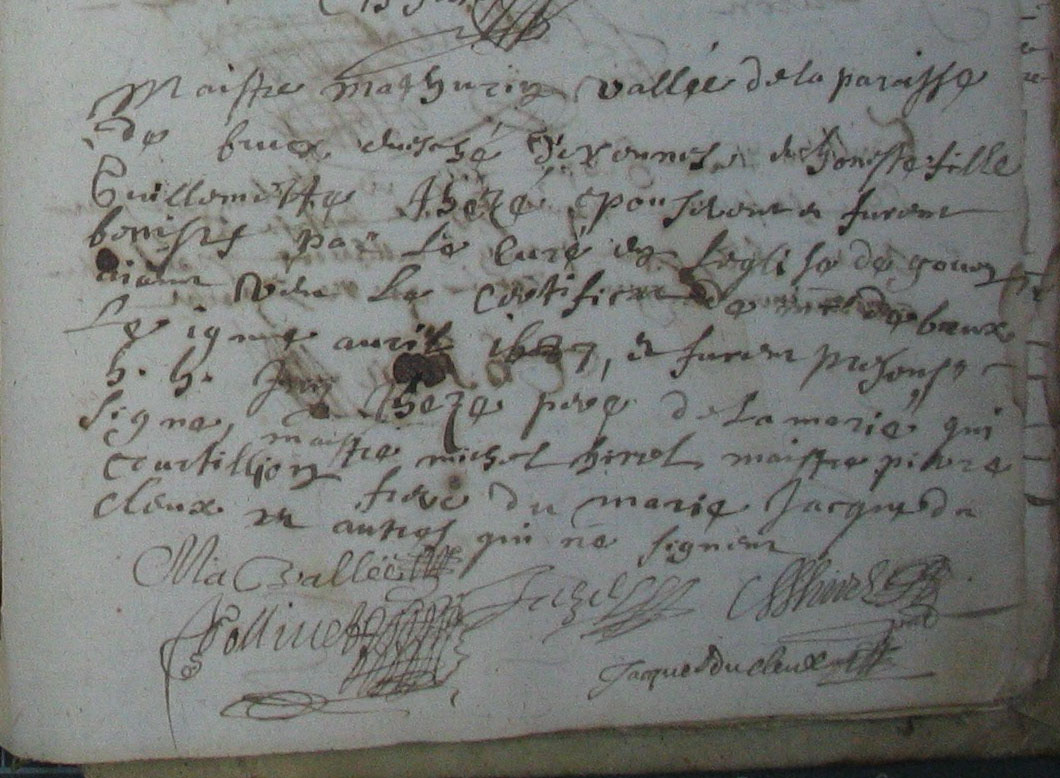 Mariée le 19 avril 1687, Goven,35580,Ille-et-Vilaine,Bretagne,FRANCE, avec Mathurin VALLÉE 1649-1704 (mariage: vue 8 / 25 - présents : le père de l'épouse, Me Michel Harel, Me Pierre Courtillon frère du marié, Jacques Ducleux),