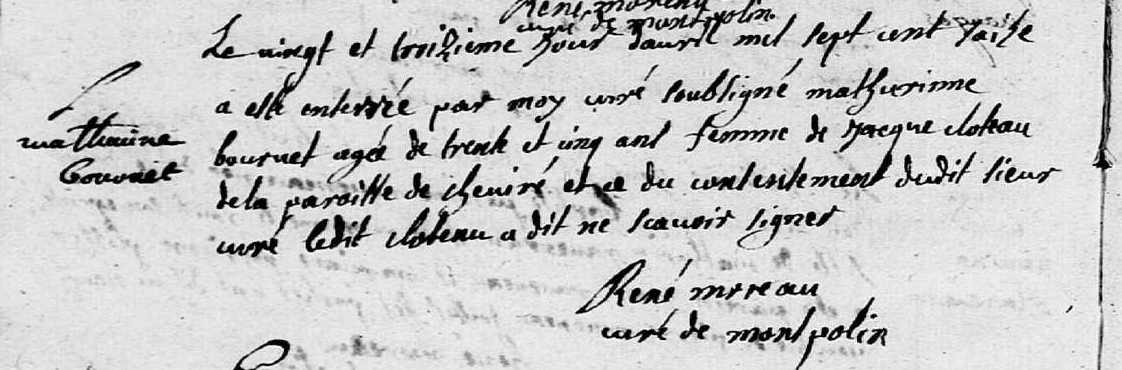 Naissance : calculée 1681 Décès : 23 avril 1716 à Montpollin 49150