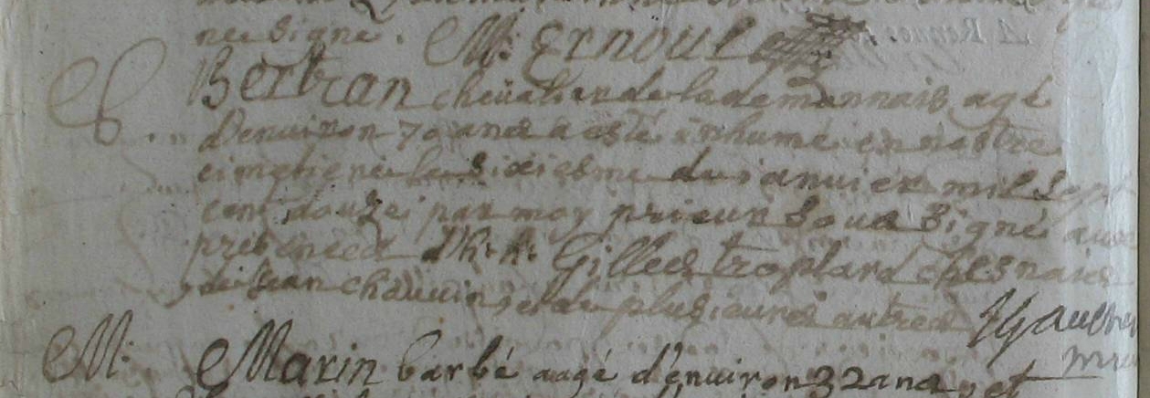 Naissance : calculée 1642 Inhumation : 6 janvier 1712 à Bazouges-La-Pérouse 35560 La demannais
