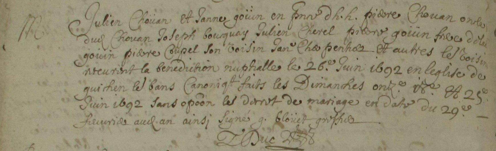Témoins :CHOUAN Pierre ( < 1672 - > 1692 )