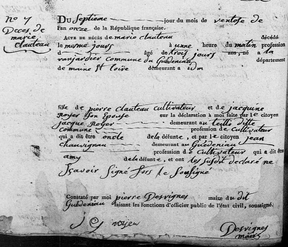 Décès : 7 ventôse an XI à Le Guédéniau 49150