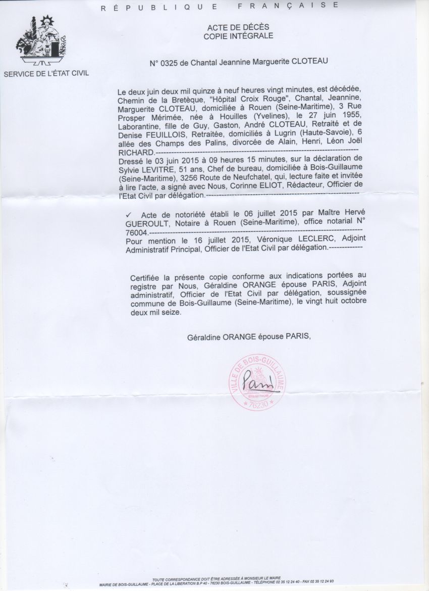 Décès : 2 juin 2015 à Bois-Guillaume 76230 Hôpital de la Croix Rouge