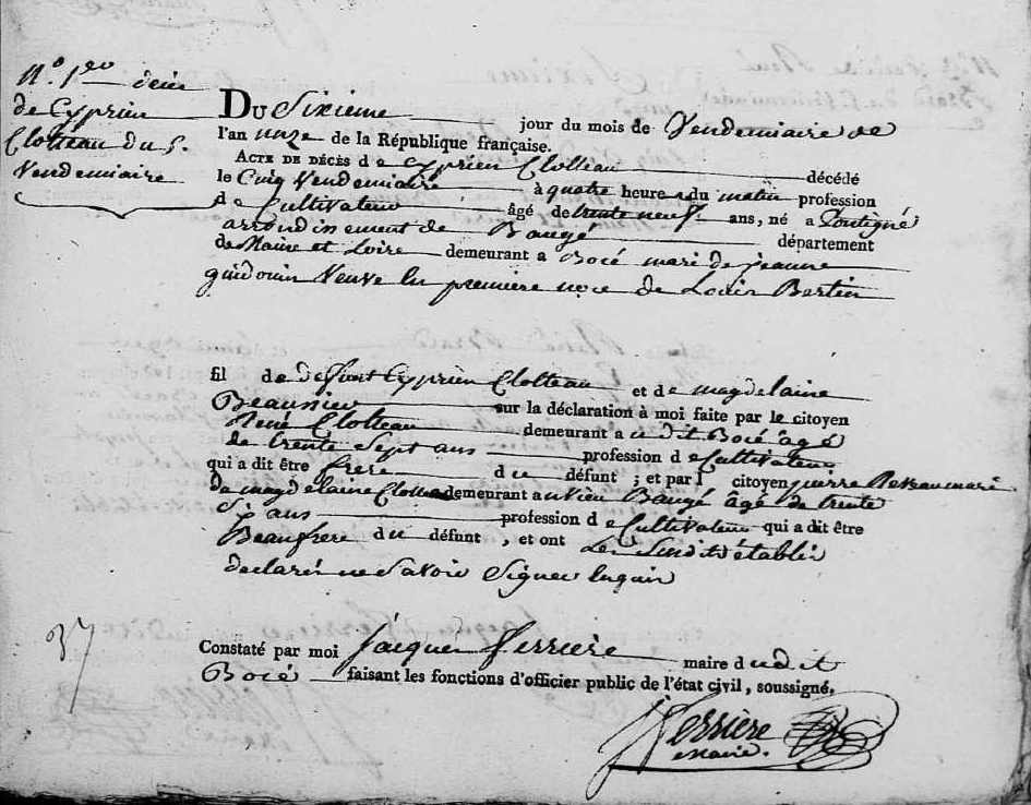 Décès : 5 vendémiaire an XI à Bocé 49150