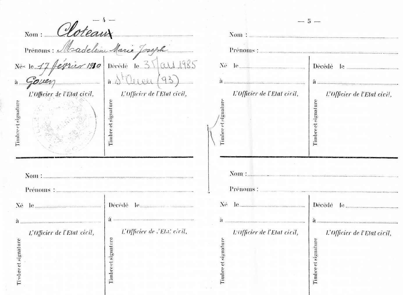 CLOTEAUX Madeleine Marie Joseph ( 1910 - 1985 )