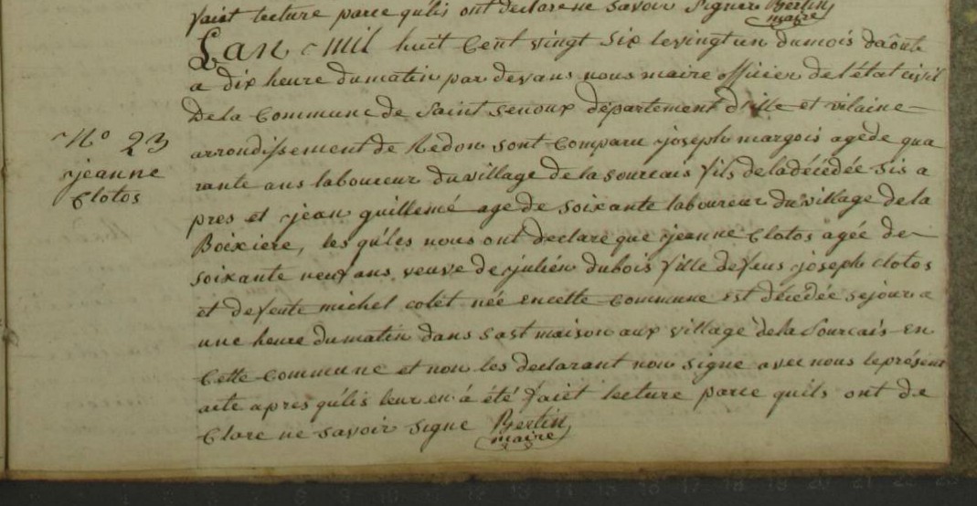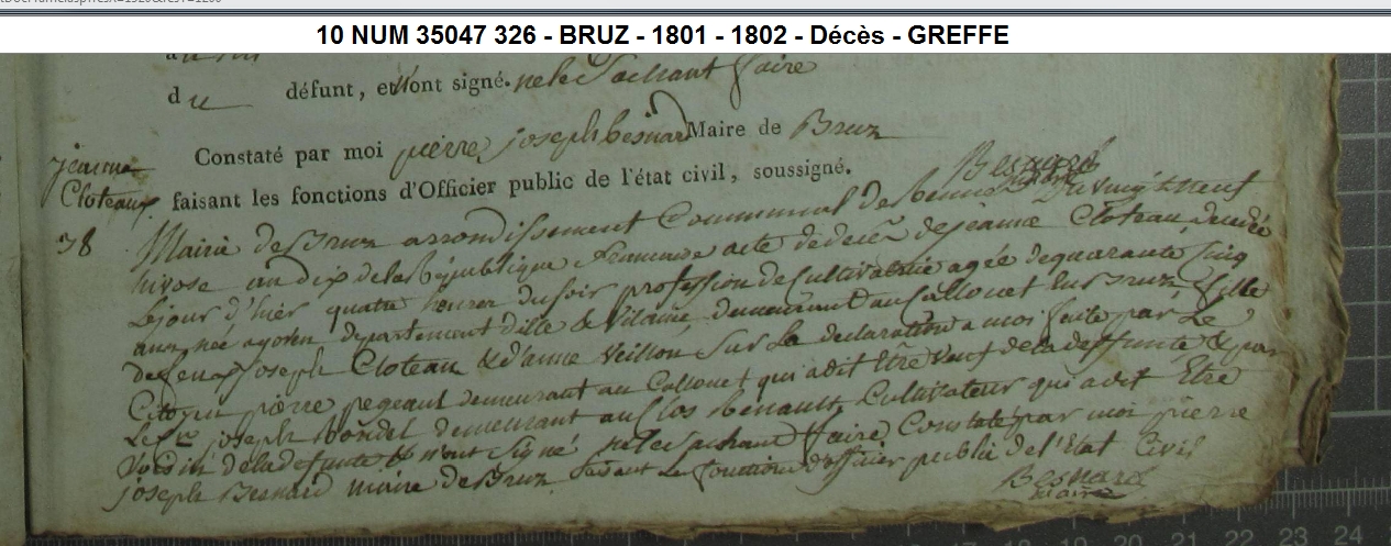 ou CLOTAUX JanneDécès : 28 nivôse an X à Bruz 35170 Callonet Inhumation : 29 nivôse an X à Bruz 35170