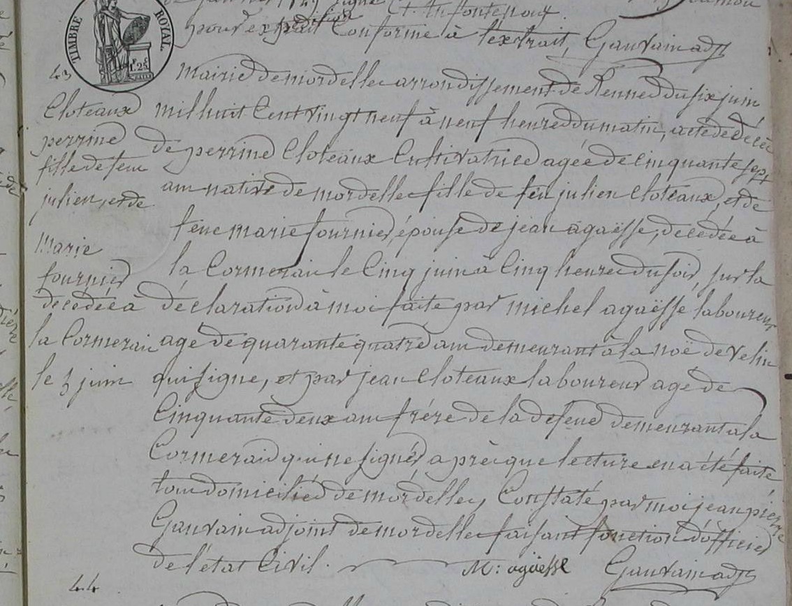 Naissance : 4 avril 1773 à Mordelles 35310 Décès : 5 juin 1829 à Mordelles 35310