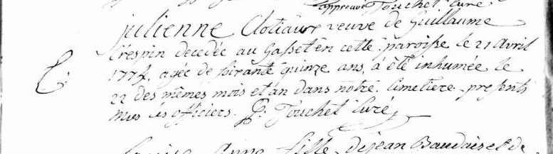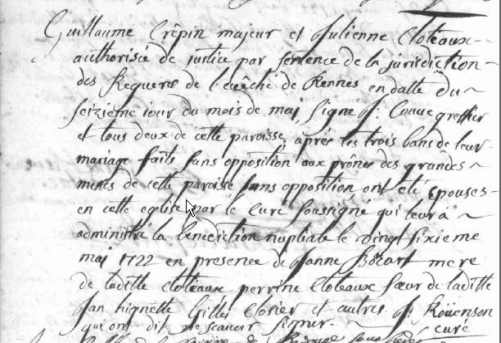 Mariée le 26 mai 1722, ,Rennes (Toussaints),35238,35,France, avec Guillaume CRESPIN 1694-1761 (Parents : Thomas CRESPIN ca 1656-1701 & Guillemette GUÉRIN 1664-1722/) (témoins : Janne BOCART /1675-1722/ , Perrine CLOTEAUX ca 1689-1752 , Jean HIGNETTE , Gilles CLOSSIER ) (mariée autorisée par juridiction des Régaires de l'Eveché de Rennes le 16/5/1722), dont