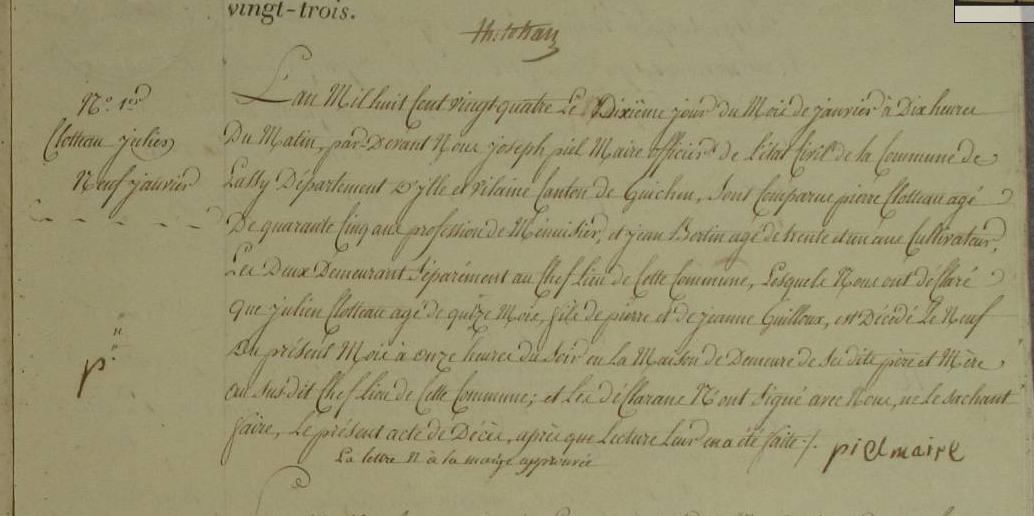 Naissance : vers 1er janvier 1824 à Lassy 35580 Décès : 10 janvier 1824 à Lassy 35580