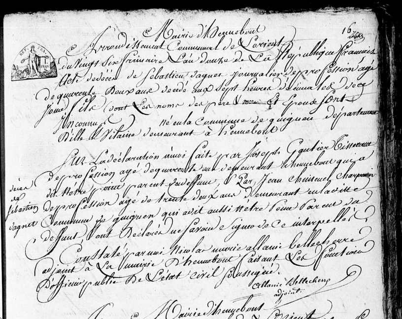 Officiant : Lucas LouisDécès : 18 prairial an V à Guignen 35580 Vau Rouault