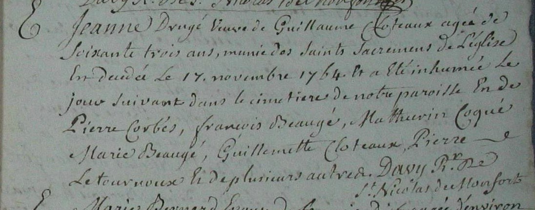 Naissance : calculée 1701 à Montfort-Sur-Meu 35160 Paroisse Saint Nicolas Décès : 17 novembre 1764 à Montfort-Sur-Meu 35160