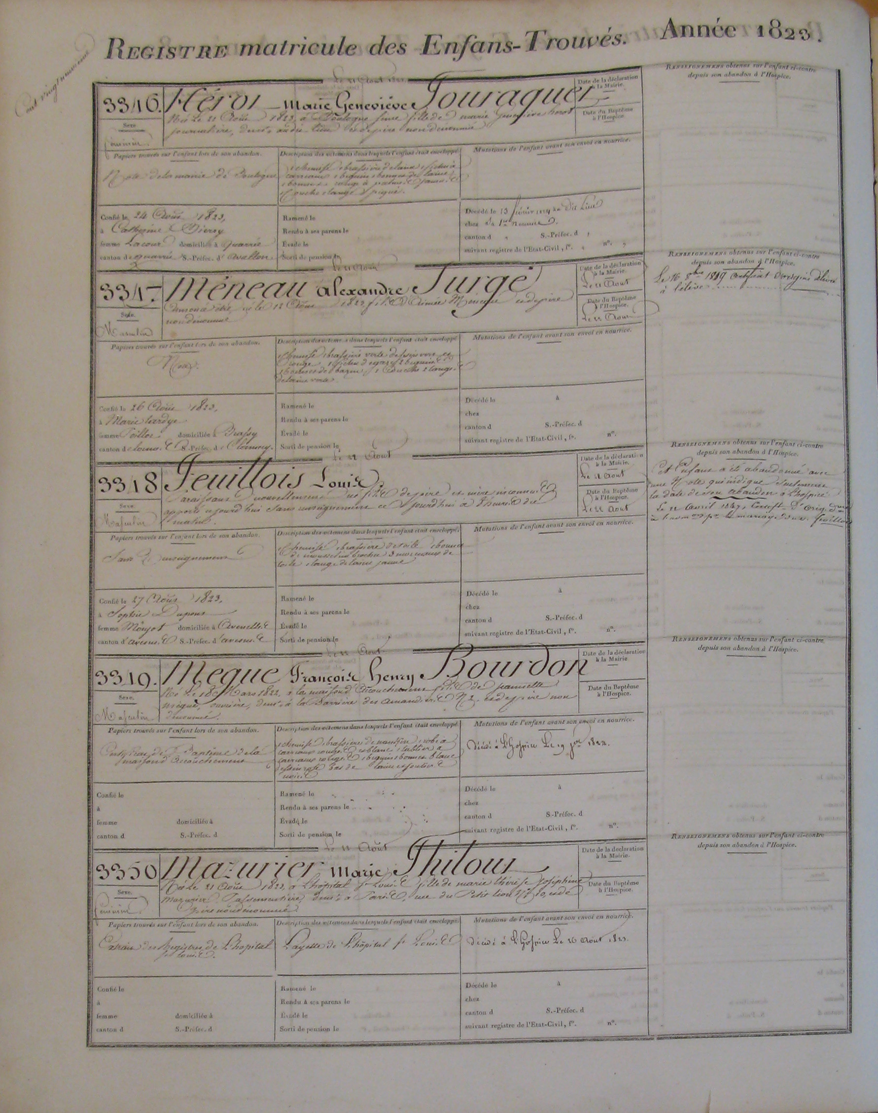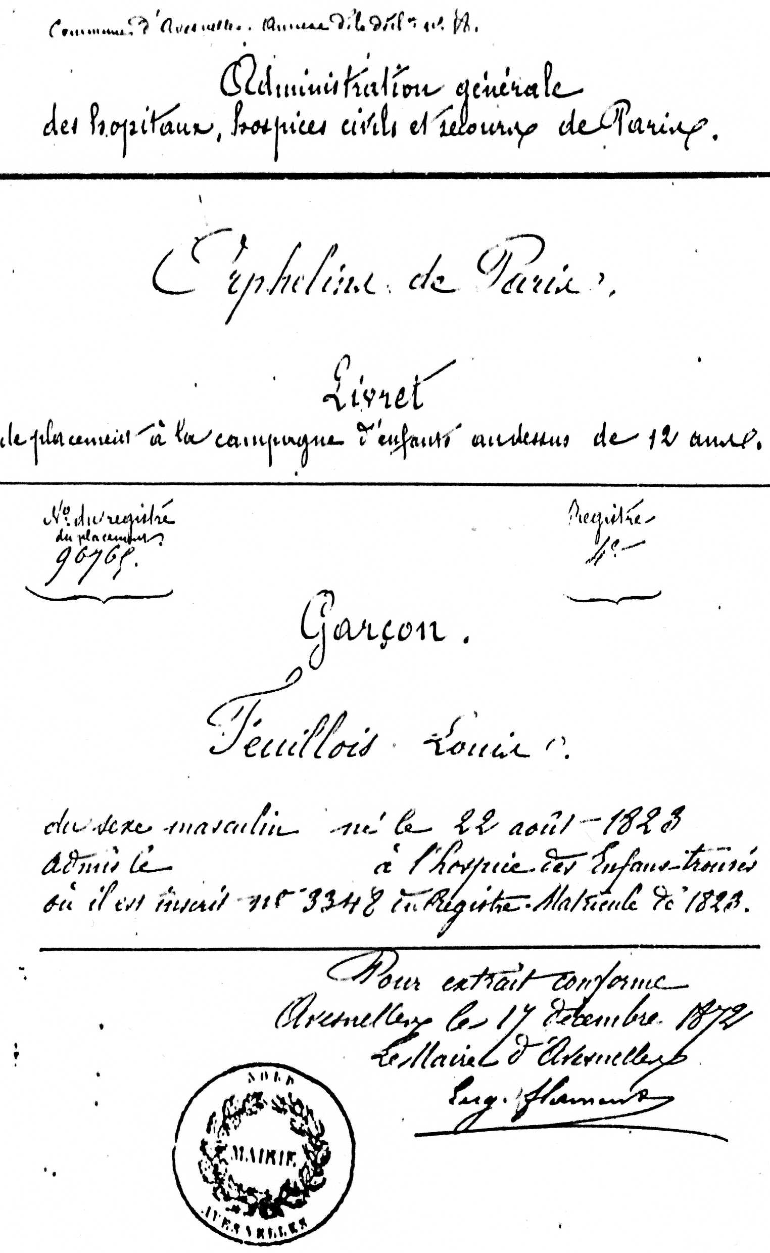 Note individuelle : L'histoire familiale dit : " L'enfant aurait été découvert par des éboueurs dans une poubelle et déposé par l'un d'entre eux à l'hospice"