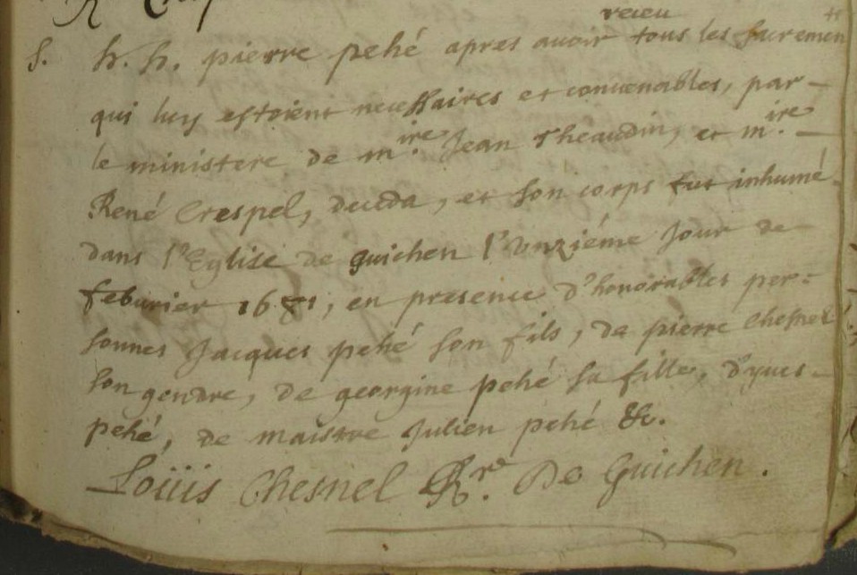 1658 M MOREL Julienne avec PEHE P. Non Guichen - Janne sa femme le 14 octobre 1662 présenteInhumation : 11 février 1681 à Guichen 35580 Eglise