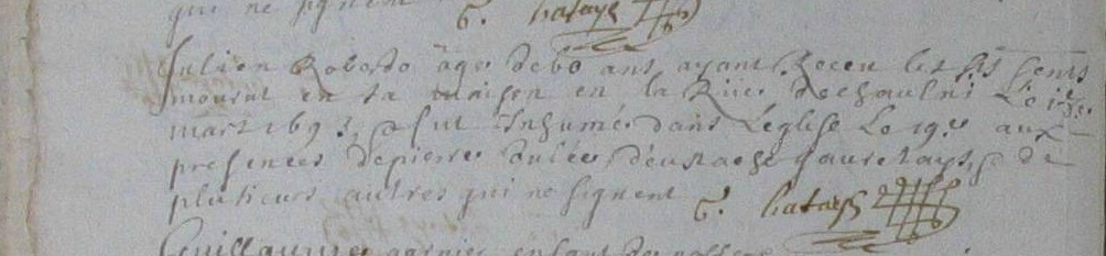 Né vers 1643 - Breal sous Montfort,Décès : 18 mars 1693 à Bréal-Sous-Montfort 35310 Sa maison en la Rüe dechoulni Inhumation : 19 mars 1693 à Bréal-Sous-Montfort 35310 Eglise
